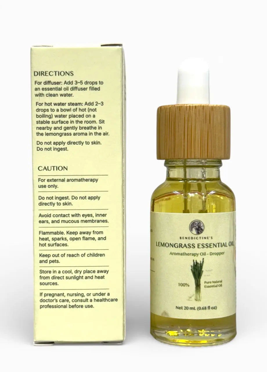 Benedictine’s Lemongrass Aromatherapy Oil – Dropper is a 100% pure natural essential oil crafted for diffusers and hot water steam use. The dropper format makes it easy to control the amount for your preferred aroma intensity.